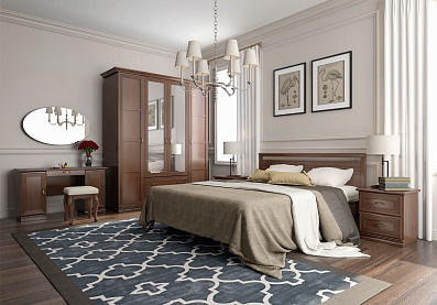 Светлые классические спальни – оптимальный вариант для просторных помещений, в которых есть возможность разместить массивную мебель. Центральным элементом в таком интерьере служит кровать с большим, роскошным изголовьем с обивкой или резными элементами. Дополнением могут служить различные предметы мебели: платяные шкафы, комоды, прикроватные тумбы, кресла, пуфы, туалетные столы с зеркалами.