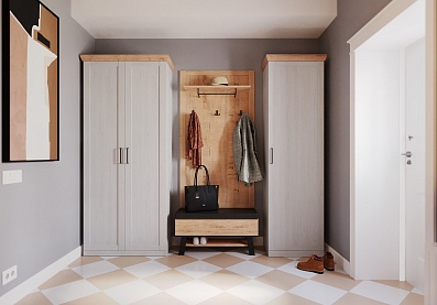 - Мебель выполнена в цвете «дуб бунратти», задняя стенка и донья ящиков — в цвете «черный графит»;