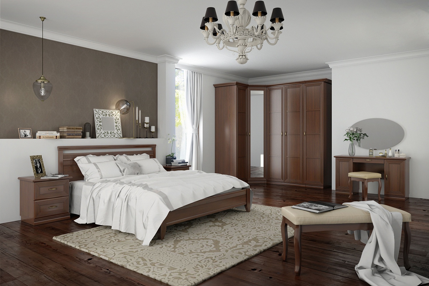 Чтобы сделать интерьер более завершенным, вы можете дополнительно приобрести металлические аксессуары в бронзовых оттенках и абстрактные постеры с яркими акцентами. Для большего удобства композицию можно завершить мягким пуфом или банкеткой в тон мебели. Не забудьте про туалетный столик, который сделает утренние и вечерние ритуалы еще приятнее.