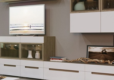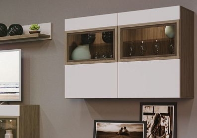 - Корпус мебели Анри выполнен в цвете «давос трюфель», фасады — в бежевом цвете;