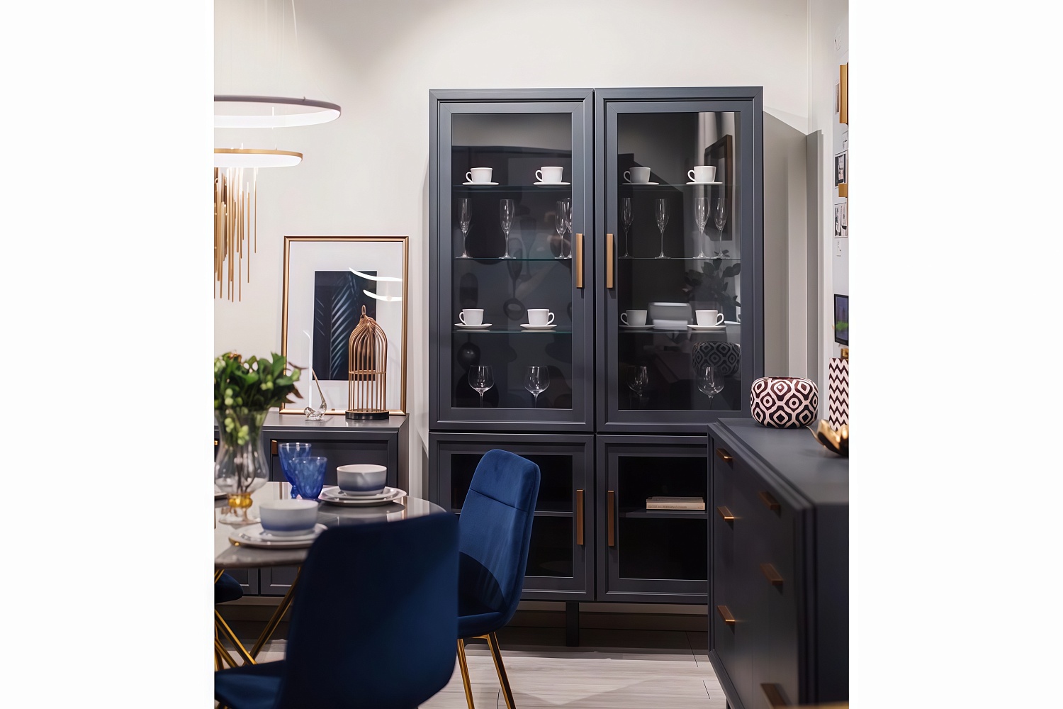 - Два отделения со шпонированными внутренними полками, за двумя распашными стеклянными дверцами в нижней части. И по умолчанию оснащен 6 стеклянными полками в верхней части шкафа;